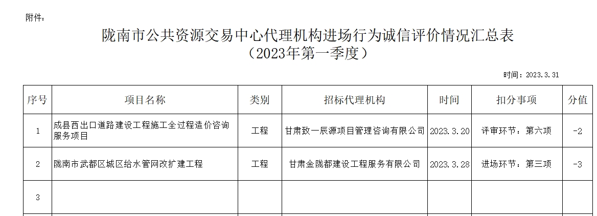 根據(jù)《甘肅省公共資源交易代理機(jī)構(gòu)管理辦法》(甘政辦發(fā)〔2019〕107號(hào))和《隴南市公共資源交易中心代理機(jī)構(gòu)進(jìn)場(chǎng)行為誠(chéng)信評(píng)價(jià)實(shí)施制度(試行)》規(guī)定,現(xiàn)對(duì)2023年第一季度,共2家代理機(jī)構(gòu)2條進(jìn)場(chǎng)行為誠(chéng)信評(píng)價(jià)記錄予以通報(bào)(詳見(jiàn)附表)。請(qǐng)各代理機(jī)構(gòu)嚴(yán)格遵守各項(xiàng)規(guī)章制度、誠(chéng)實(shí)守信,規(guī)范操作,為招標(biāo)人和采購(gòu)人提供專業(yè)、高效、規(guī)范的招標(biāo)代理服務(wù)。