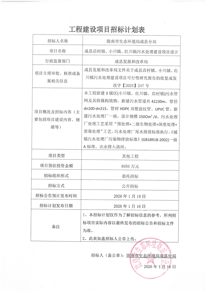 成縣店村鎮(zhèn)、小川鎮(zhèn)、紅川鎮(zhèn)污水處理建設項目設計
