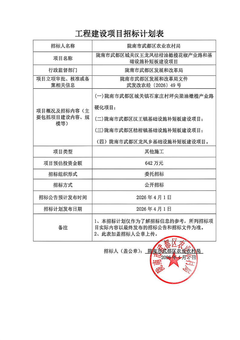 隴南市武都區(qū)城關(guān)漢王龍鳳桔柑油橄欖花椒產(chǎn)業(yè)路和基礎(chǔ)設(shè)施補(bǔ)短板建設(shè)項(xiàng)目