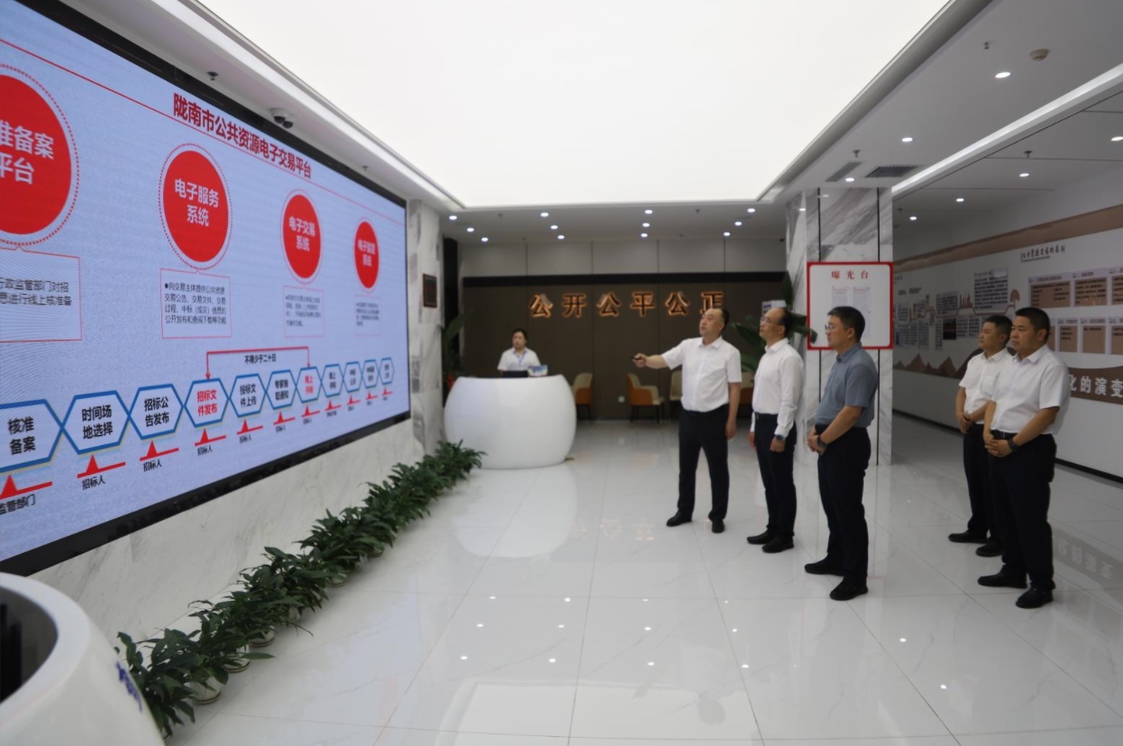 在調研過程中,李榮先后察看了交易服務大廳、網(wǎng)上開標直播大廳、專家抽取室、封閉評標區(qū)、多功能交易廳、黨建活動中心、行業(yè)監(jiān)管區(qū)、電子檔案管理室等運行情況,現(xiàn)場認真聽取了有關情況的匯報。對交易中心在場所設施保障、推行全流程電子化交易、黨建與業(yè)務融合發(fā)展、營造良好營商環(huán)境等方面工作給予了充分肯定。